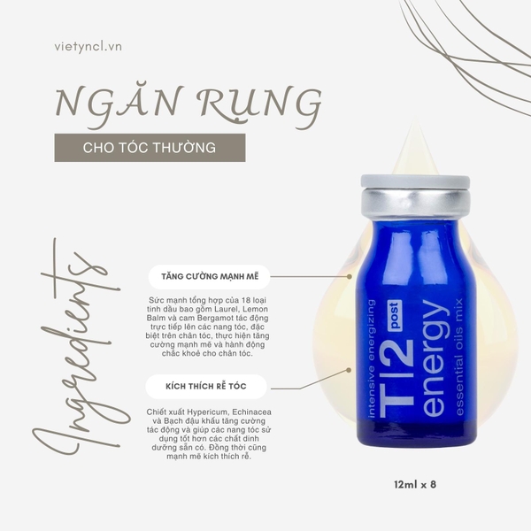 Thay đổi khí hậu và rối loạn cơ thể có thể cản trở sự phát triển của tóc, làm gián đoạn quá trình cung cấp chất dinh dưỡng cho chân tóc khiến nang tóc không đủ oxy hoá. Cung cấp kém chất dinh dưỡng cho rễ và không đủ ôxy hóa làm chậm mọc tóc và rụng tóc. Sức mạnh tổng hợp cụ thể của các loại tinh dầu và hoạt chất tự nhiên các chất trong T2 Energy - Hỗ trợ chuyên sâu điều trị tóc yếu - rụng tóc giúp tăng cường sức mạnh và làm chắc khoẻ, bóng tóc bằng cách can thiệp trực tiếp vào gốc . Tóc giảm tình trạng rụng tối ưu nhất.